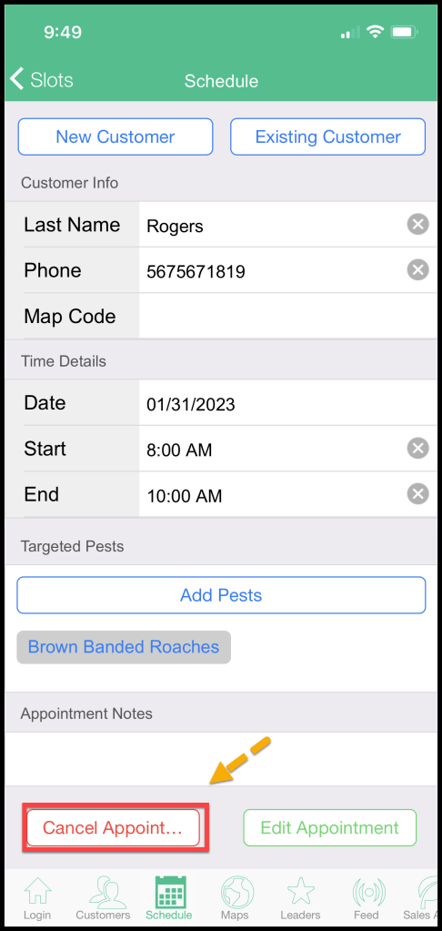 Sales users can cancel a customer’s pending appointment by pressing the customer on the route in PestRoutes Sales, and pressing Cancel Appointment at the bottom of the page. When you cancel an appointment, a dialog box will appear, prompting you to confirm the cancellation and provide a reason.