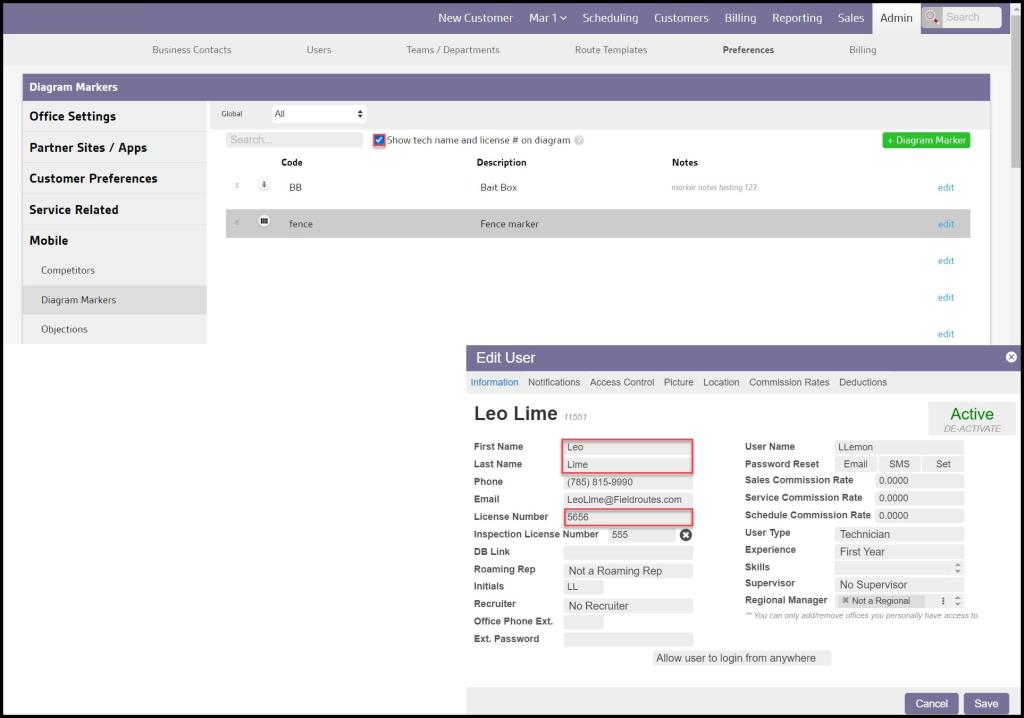 - The tech name will display automatically based on the logged-in user that is viewing the diagram, if Show tech name and license # on diagram (Admin > Preferences > Mobile > Diagram marker) has been selected. If the user has a license number (Admin > Users > Select the Preferred User > Information > License Number), that will show as well.