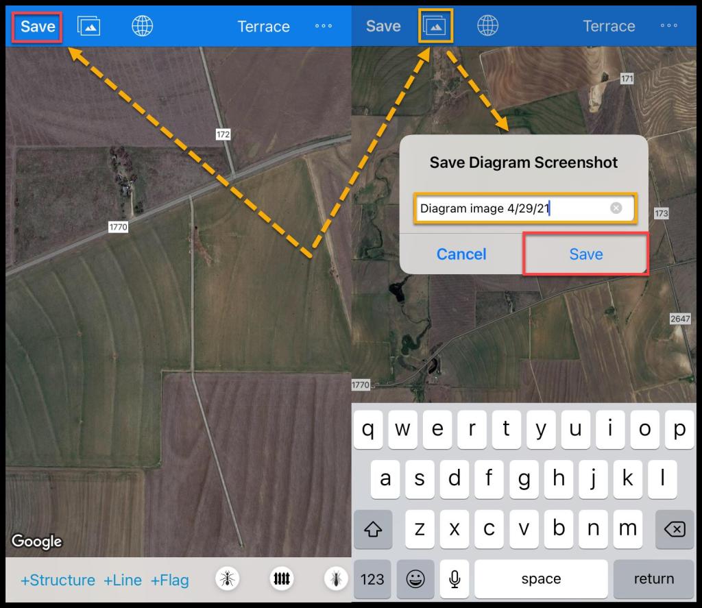 - Screenshot: To save the diagram to Pestroutes and to add the diagram to forms, save the diagram as a screenshot. Tap the icon to the right of the “Save” button. This action will also allow the user to rename the diagram as well.