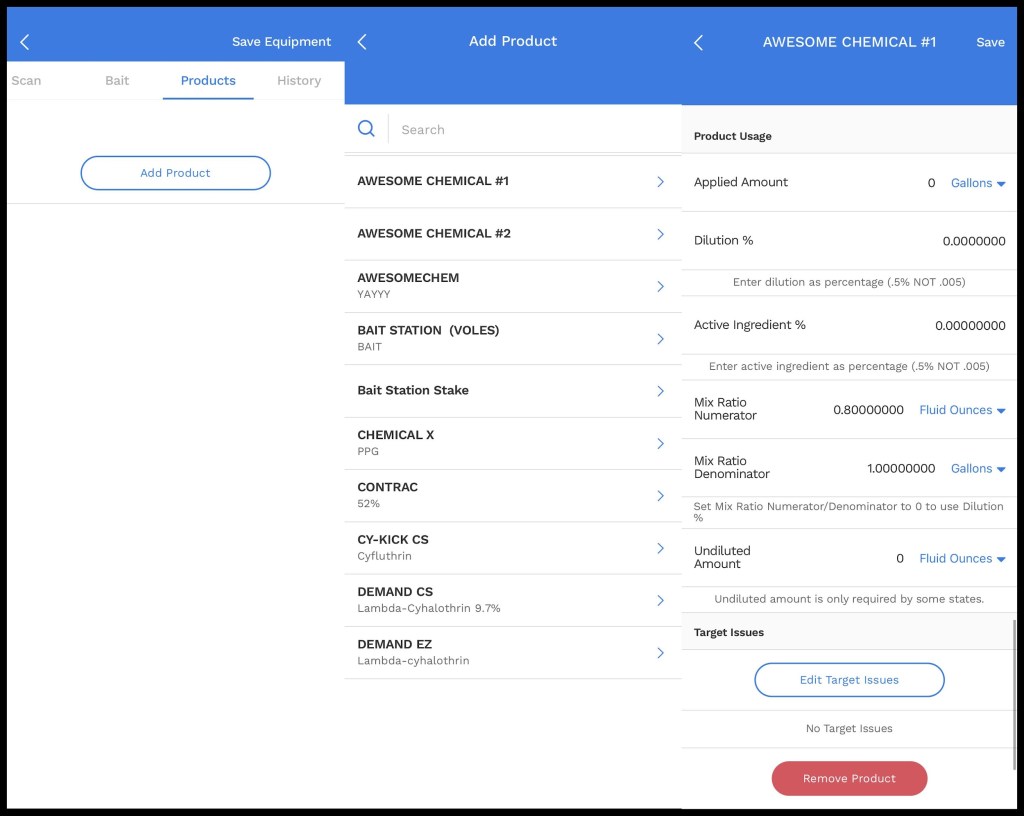 - Target Area: The Target Areas field shows the technician what kind of area (like a playground, lawn, or barn) they would use the equipment on to address the target issues. Select a target area from the field.