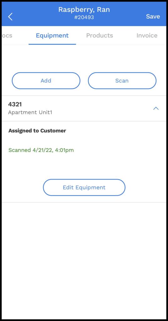 The Equipment tab stores equipment scanned or entered manually by technicians in the mobile apps. The tab is beneficial to view details on what equipment was scanned, any applicable details the technician wants to add, and see detailed activity regarding the equipment for the customer.