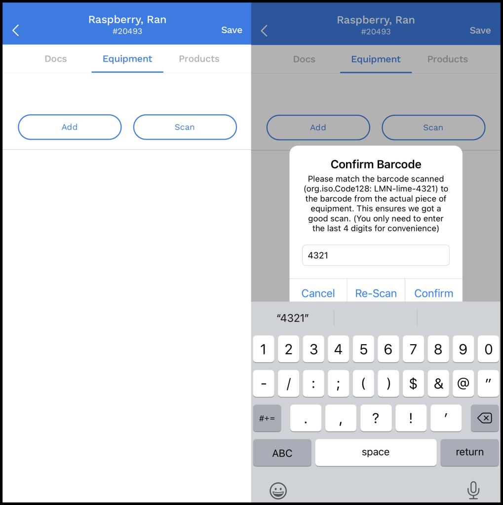Scanning a new barcode will prompt the user to verify the last four digits of the barcode, then bring up a screen to add the equipment information for the barcode.