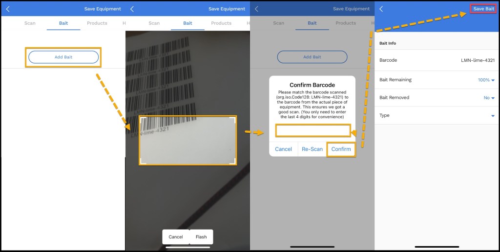 Bait > Add New > Scan or enter the barcode > confirm the barcode. The Bait screen will have a few options.