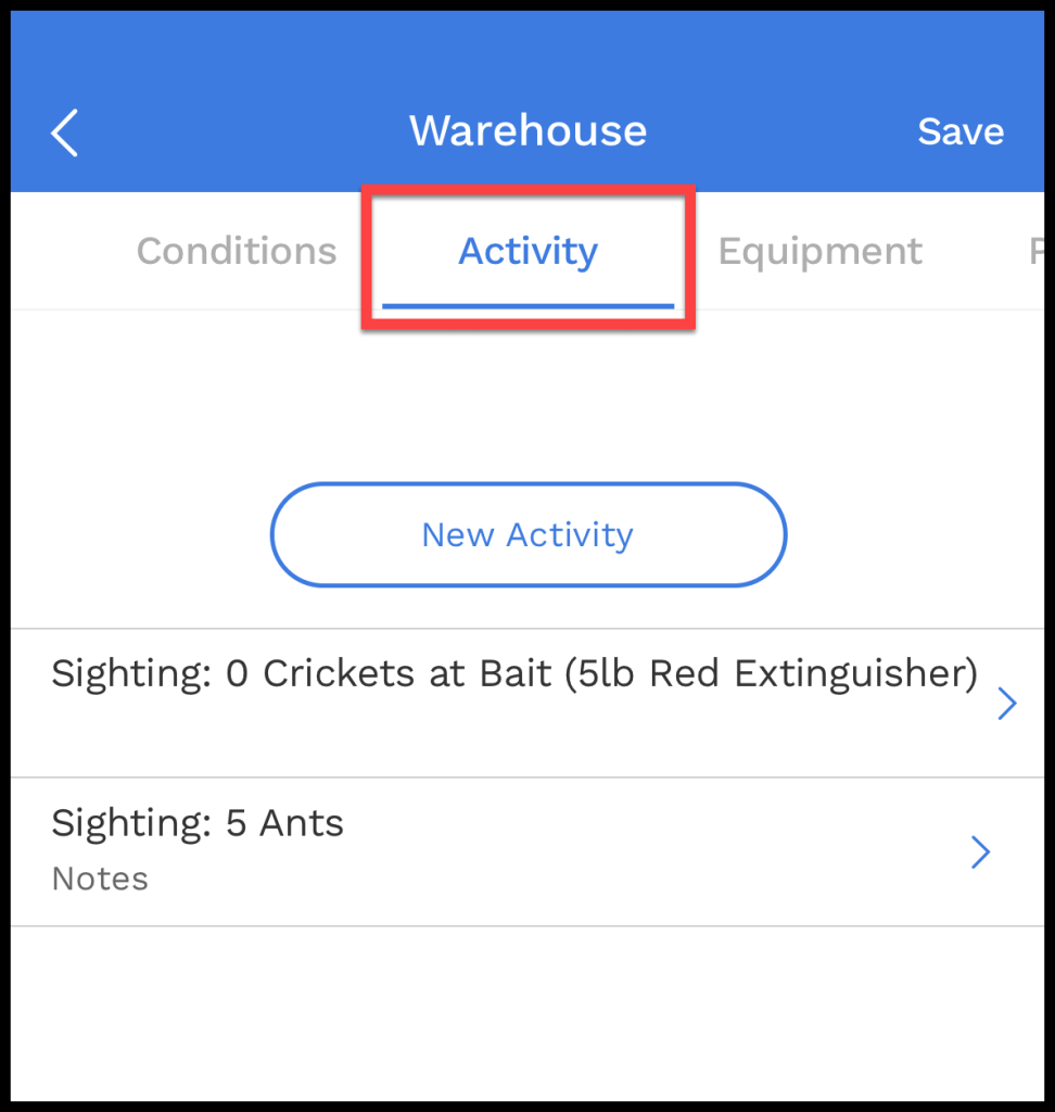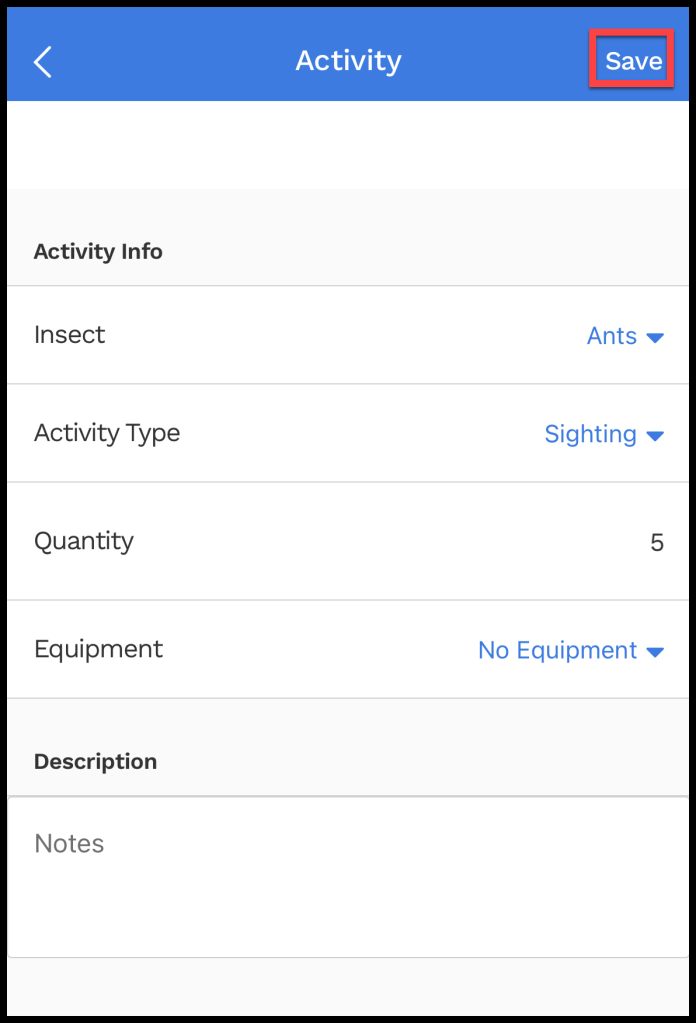 The technician can report pest activity in the Activity area. The technician designates the particular pest, and the activity type (sighting, evidence, and capture). The quantity is entered if the technician records a sighting or a capture. If evidence is found, enter the evidence type and a detailed description. An activity report is needed for each pest if there are multiple pests.