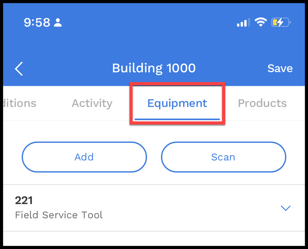 Equipment functions like the Scan tap in the mobile app except for the Activity tab. Activity report for the equipment will make the same activity show on the sub-structures’ Activity tab. The technician can also enter an Exception type: Skipped, Removed or Replaced.