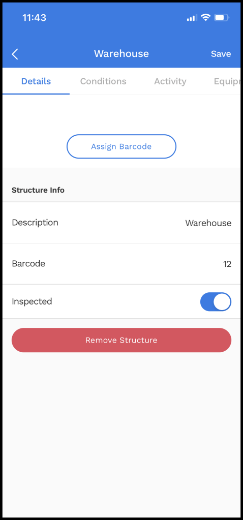 The technician can update the name of the sub-structure, include a Barcode if available, and toggle if the sub-structure has been inspected.