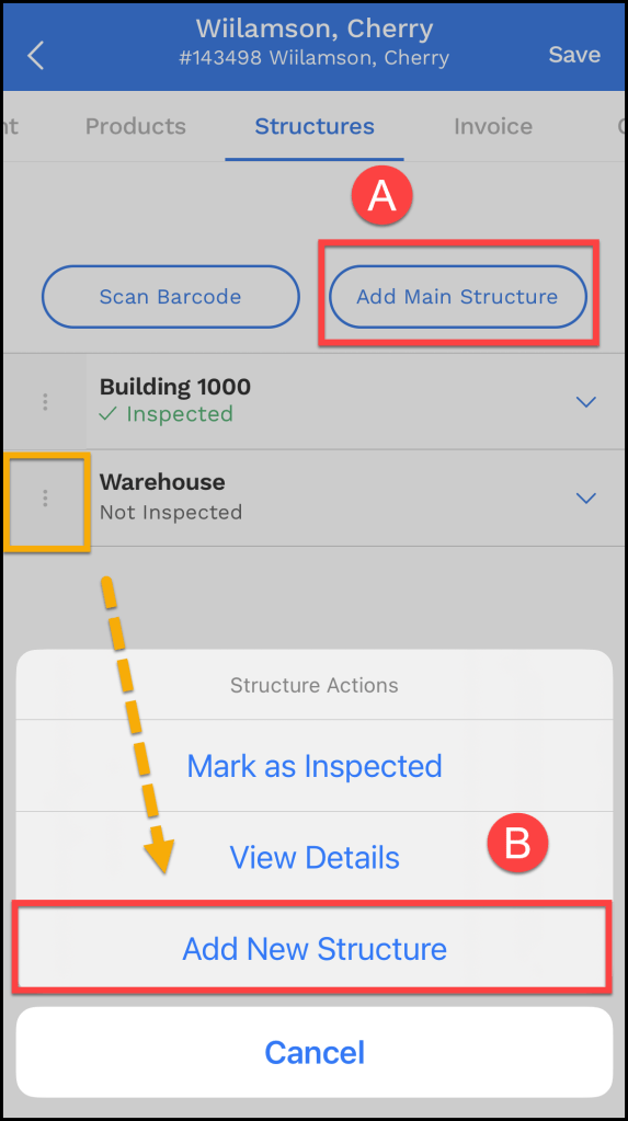 - Adding a Substructure: Select the structure actions (⋮) and select add new Structure. Sub-structures can be added by office users as well as mobile users anytime. The depth of the substructures will only go to a max of 3: the base plus 3 sub-structures.