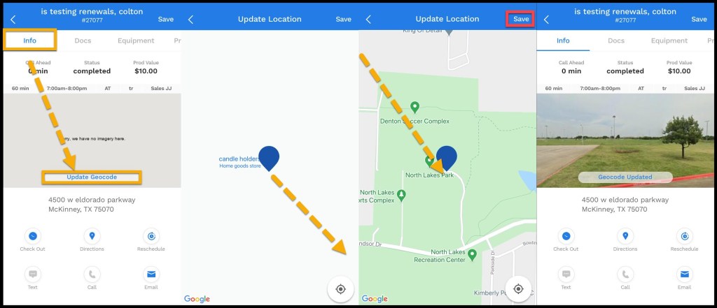 - Go to the Appointment > Info Tab > tap the Update Geocode button.