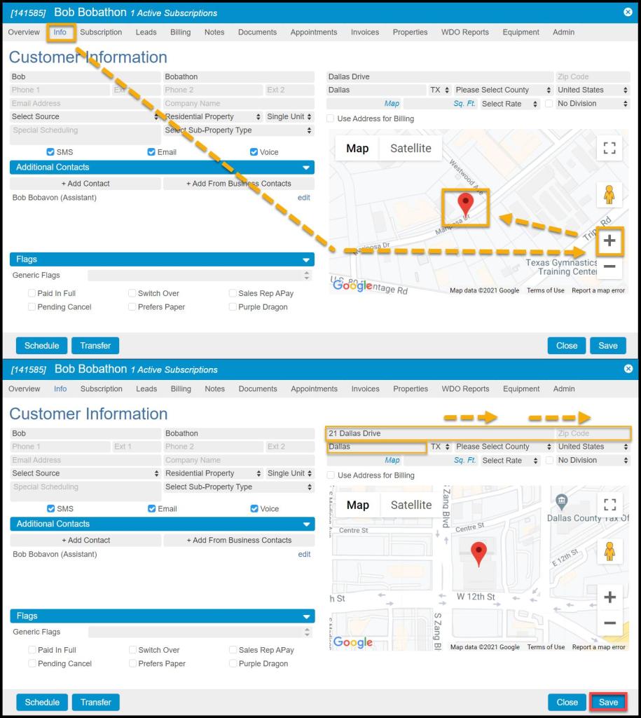 - Check the location pin (Customer Card > Info) to ensure the correct location before sending technicians out to that address for the first time.