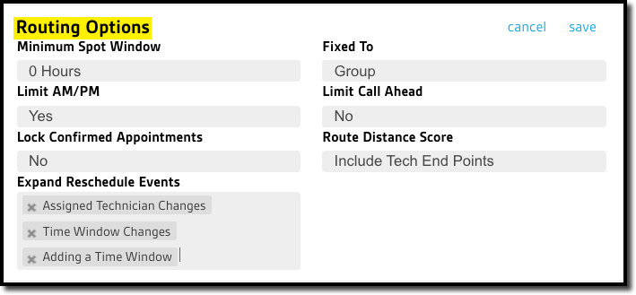 - Minimum Spot Window: Forces Fixed to Spot appointments to have at least this duration in hours (i.e. Set at 1, a timed Fixed to Spot appointment would be forced into a 1 hr window duration even if it was set to 30 min.)