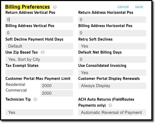 - ACH Auto Returns (FieldRoutes Payments only): This setting turns on special automation that automatically reverses a paid invoice if the ACH payment ultimate fails to process successfully. See the ACH Return Automation guide for details.
