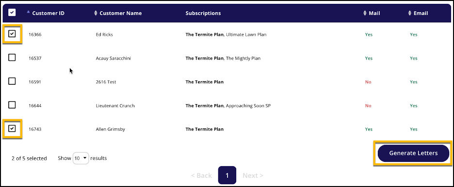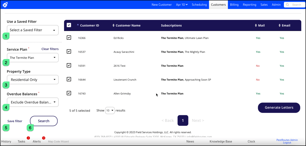 - Service Plan – The first step to generate letters would be to select a service plan from the Service Plan drop-down. Multiple plans can be selected, but remember that it will only return customers with the exact combination of Service Plans selected. For example, if The Termite Plan and Gold Lawn Plan are both selected, no results will return unless a customer(s) have that exact combination of services.