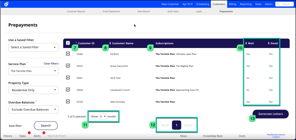 In the below image example, a template would only be created for Ed Hicks and Allen Grimsby since they are the only customers with the corresponding checkboxes selected. To open up the Prepay Wizard where a user would create the discounts and upsells for the letters click the Generate Letters button.