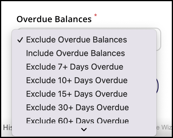 - Overdue balances – This dropdown serves as a filter for including/ excluding clients based on their financial standing. The default is Exclude Overdue Balances, but it offers customization based on date ranges that can be selected in the event someone wants to see customers with overdue balances over a certain number of days.