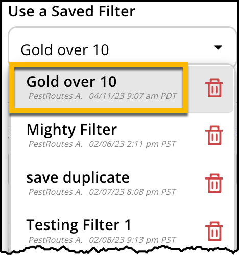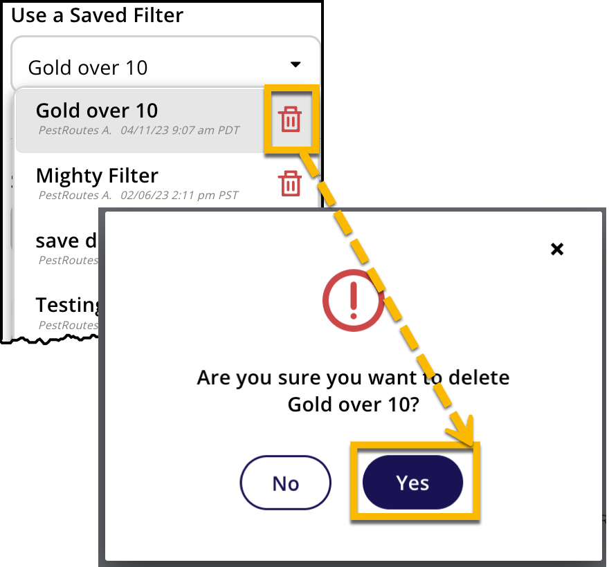 To remove a previously saved filter, click the trash can icon and then click the Yes button in the next window to confirm.