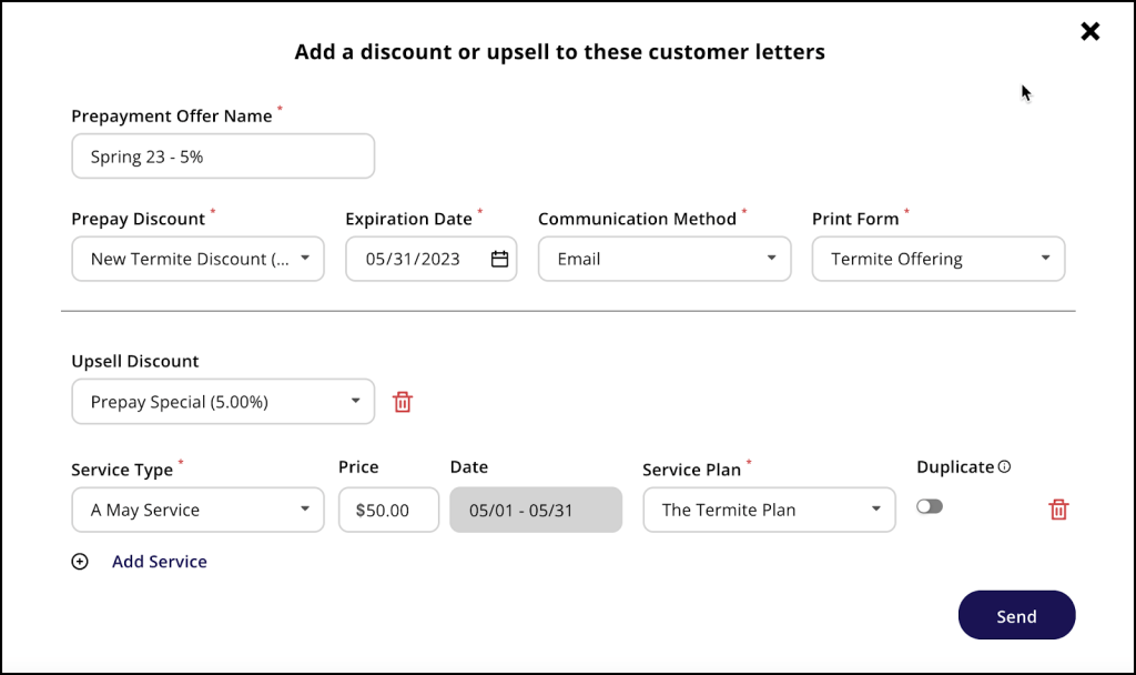 - Add Service – Clicking add service will add another line to offer an additional upsell service.