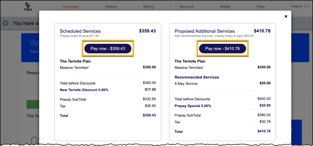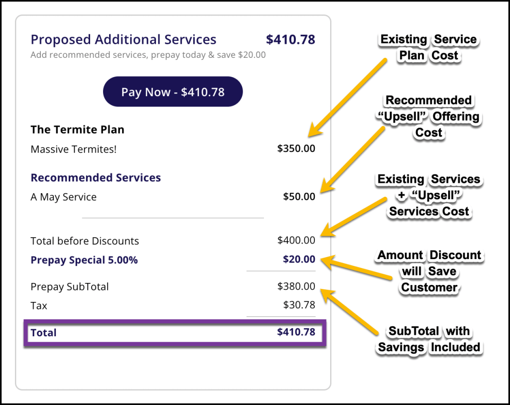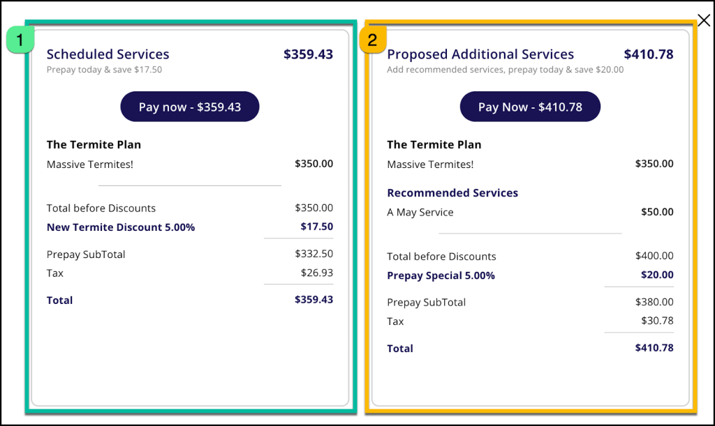 When multiple offers are available, they are listed side by side so that the customer can easily compare them and make an educated decision. The first (1) is Scheduled Service (already existing) plus a discount. The second (2) shows Proposed Additional Services plus any Recommended Services (additional upsells).