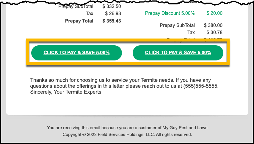 The following is an example of what an email sent to a customer would look like. Clicking either of the Click to Pay buttons will open the Customer Portal so that the offer can be chosen and paid for. Other details of this offer will be reviewed later in the Offer Details section.