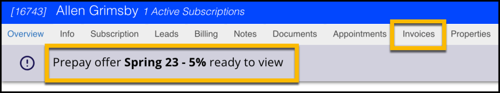 To make a payment in the FieldRoutes Ops Suite open a customer card of whom is prepaying. By default the overview tab will display showing the offer on the banner. Select the banner hyperlink to review the offer.