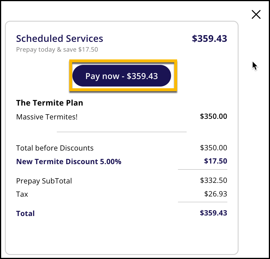 Once the hyperlink is clicked, the user will see the offer’s details in a popup. There was no upsell in this example, so there are not two columns. Only the existing service with a discount to prepay is shown. Click the pay now button.