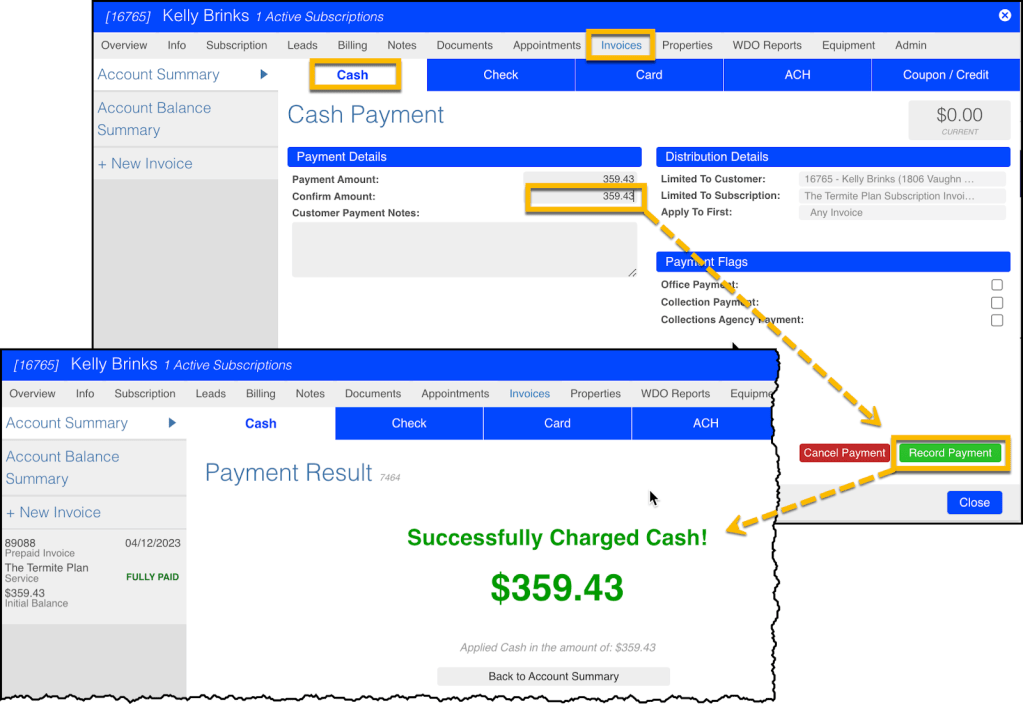 Once the Pay now button is clicked, the user is brought to the Invoice tab on the customer card, where they can choose how they want to pay. It defaults them to the cash tab, which is how the customer pays in this example. Enter the amount being paid in the Confirm Amount box, then click the Record Payment button. If a payment method other than cash is being used, click the corresponding payment type tab and apply that payment the same way before clicking Record Payment to complete.