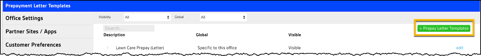 To create a new Prepay Letter Template, click the green + Prepay Letter Template button on the right.