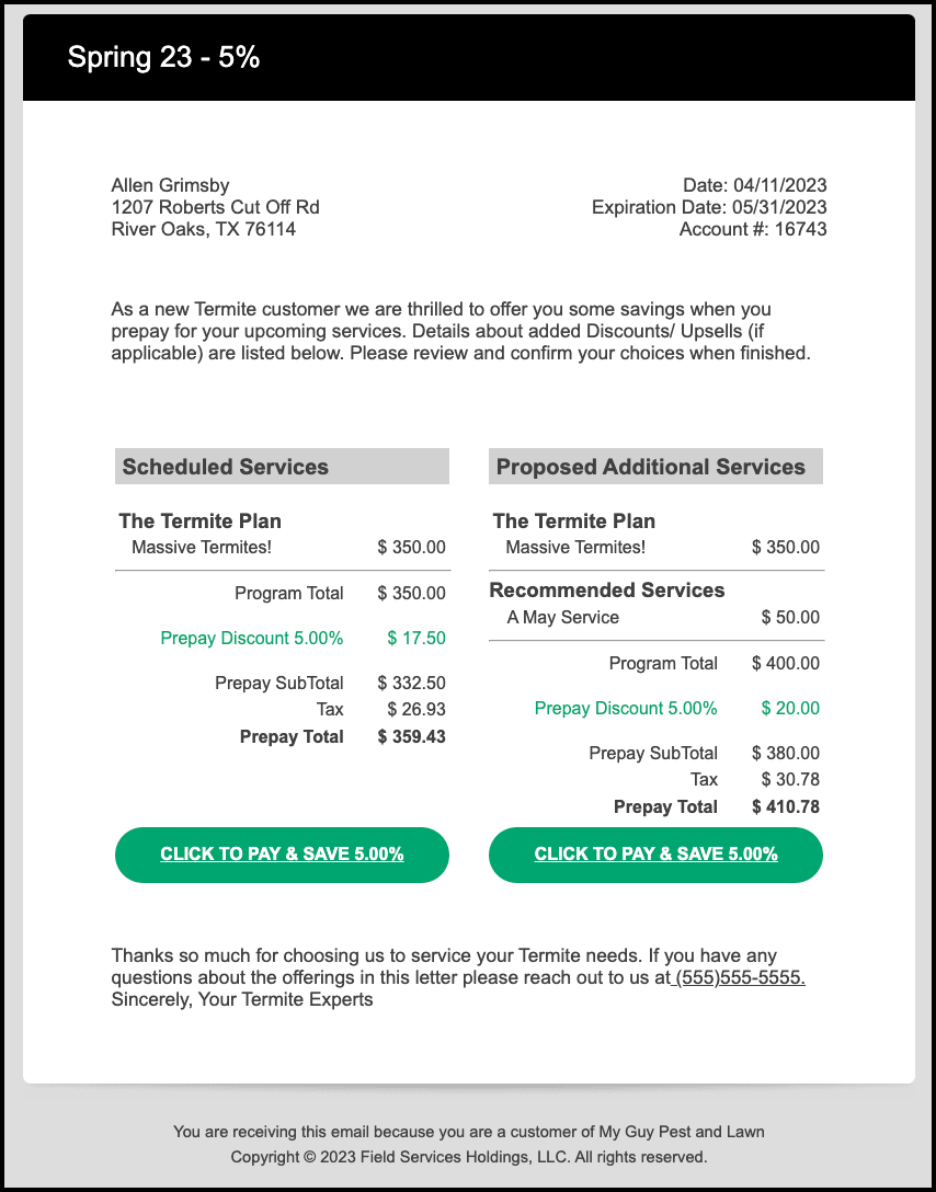 It is recommended to include contact information in the letter, especially when a company doesn’t utilize the Customer Portal or use email to send offers. For example, if the customer portal is not turned on in the Ops Suite, the email example below would not include the green Click to Pay buttons.