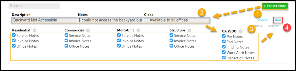 - Description: This will be the name of the Preset Note. This is not what the technician will actually input for the note in the mobile app.