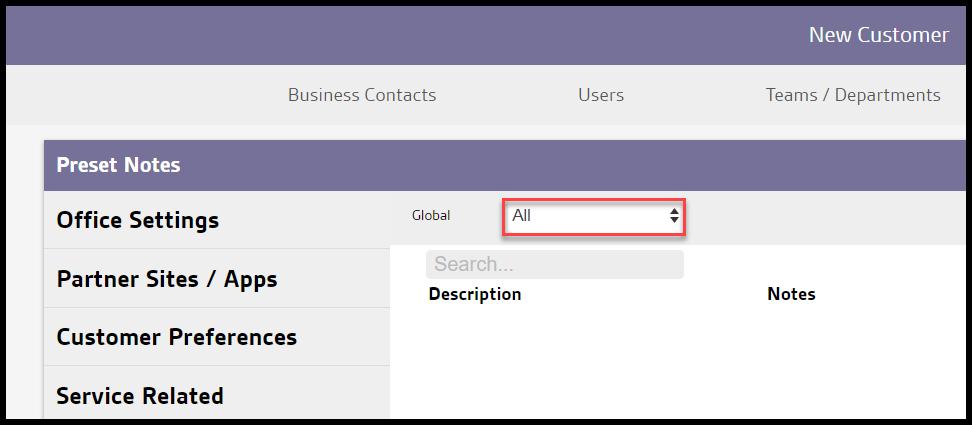 - Global: For companies with multiple offices, if a Preset Note is Specific to this Office, then it will only be available to the office the note was created in. If the note is Available to all Offices, then every branch can see the new note.