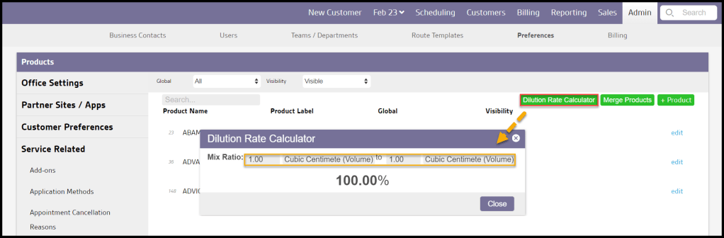 For example, Termidor SC has a dilution rate of 0.08% and 0.0625%: the user would have the product input twice in the product preferences, and one entry would have a dilution rate of 0.08%, and the other would have a dilution rate of 0.0625%.