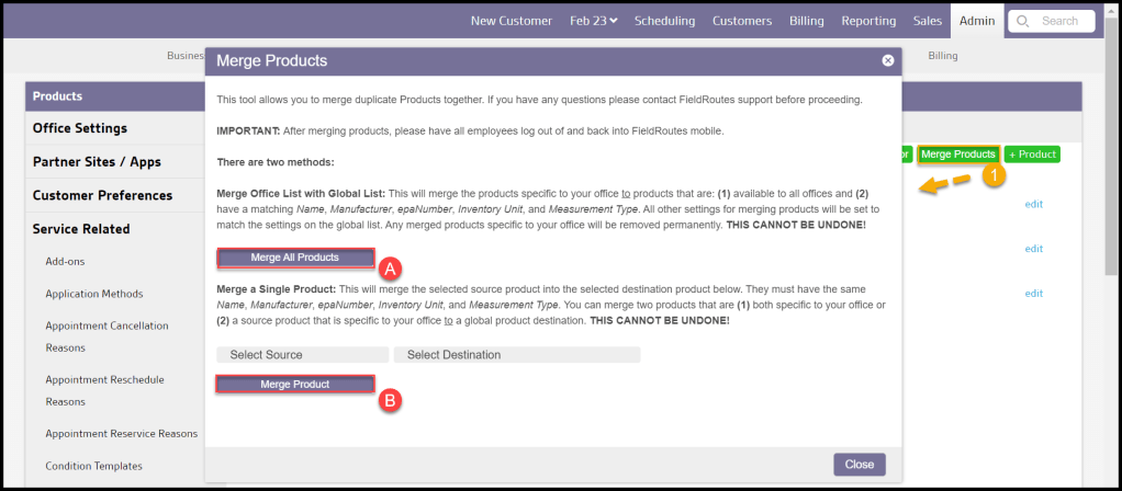 - Merge All Products: This will merge any duplicate products that are already specific to the office with any office that has a matching Product Name, EPA number, inventory unit, measurement type, and manufacturer.