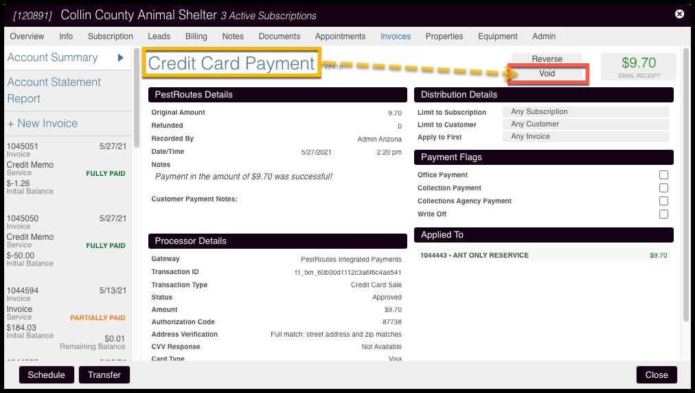 If our Integrated Payments is the payment processor, recent card and ACH payments will have the Void option. This appears during the first 24 hours after the payment is made.