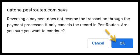 A reminder will appear, explaining that this choice only cancels the payment in the customer record, but does not initiate anything through the payment system.