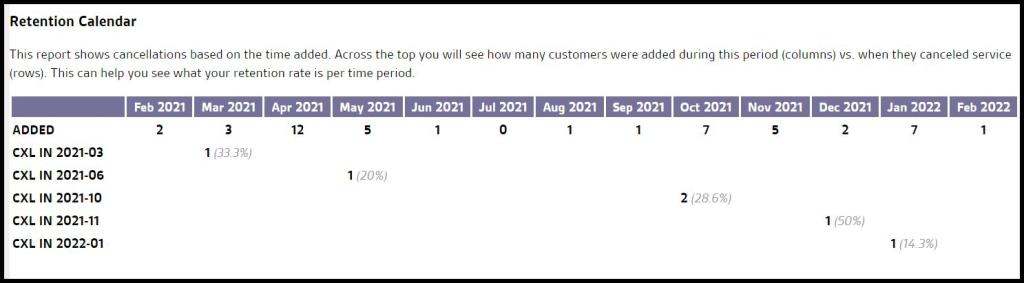 This calendar shows cancellations based on the time added. The top displays the number of subscriptions that were added during this period (columns) vs. the left side that displays when they canceled service (rows).