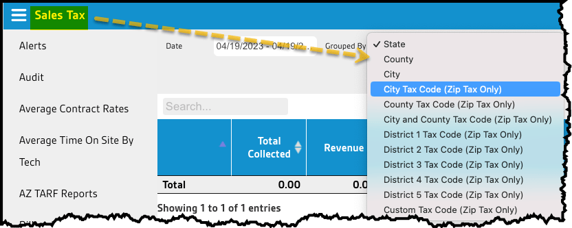 The Sales Tax Report has several data columns that provide information about Sales Tax collected. These are based on the information put into the customer card.
