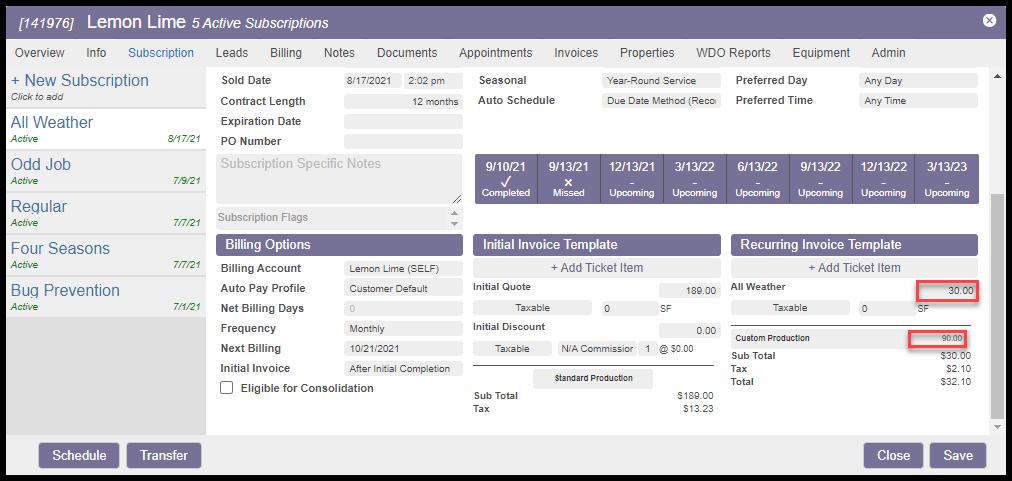 Custom Production allows the user to link the full price to the service. Custom Production is helpful if the user’s technicians are paid a commission for the services they perform. Setting a Custom Production will allow the technician to get paid based on the full value of the service versus the partial amount charged for the recurring billing.