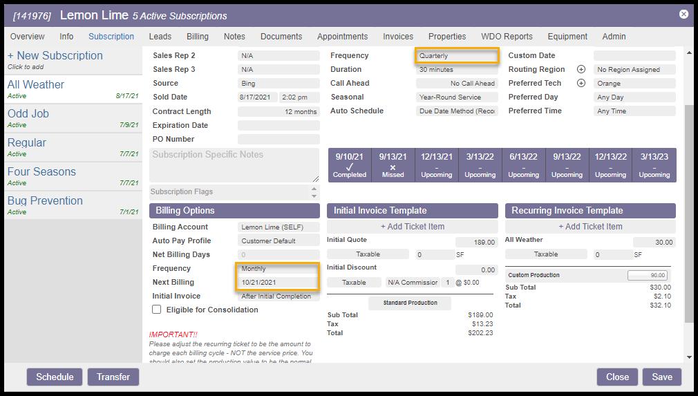For this example, we will put the customer on a monthly billing frequency for their Quarterly subscription.