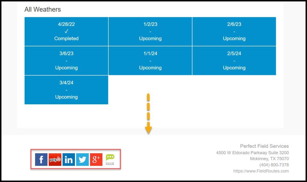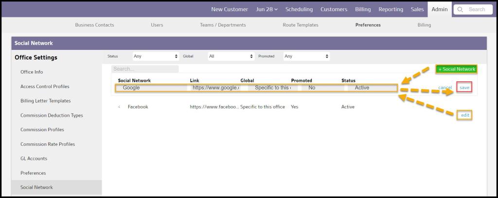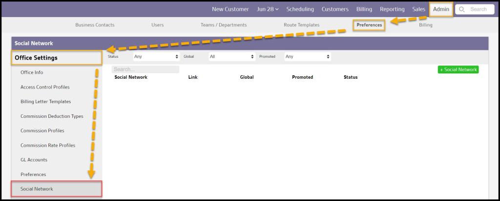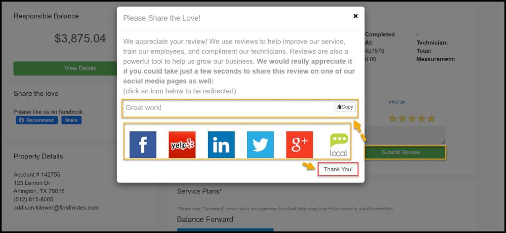 The Social Network preference adds certain social media pages to the Customer Portal so customers can add reviews on social media after a service.