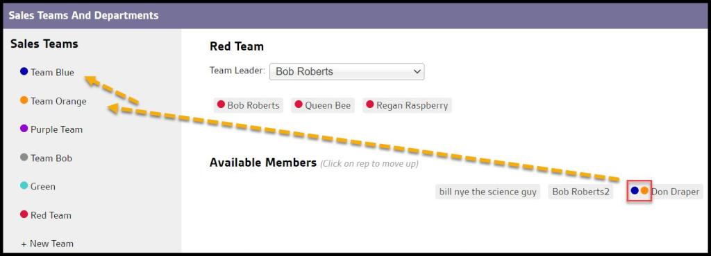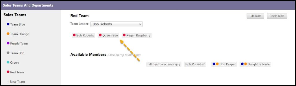 Click on a sales user’s name to add or remove the member from the team. You can assign a team leader to the team as well.
