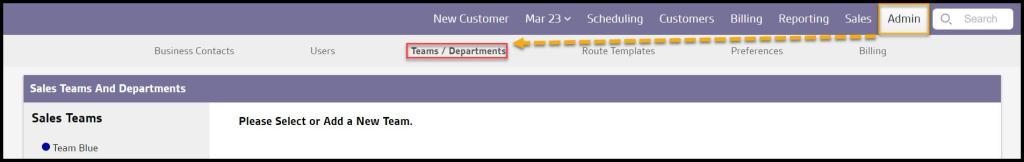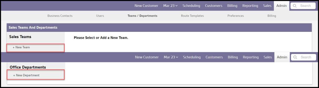Select + New Team to the left under Sales Teams to add a new sales team. Likewise, to add a new office department select + New Department to the left under Office Departments.