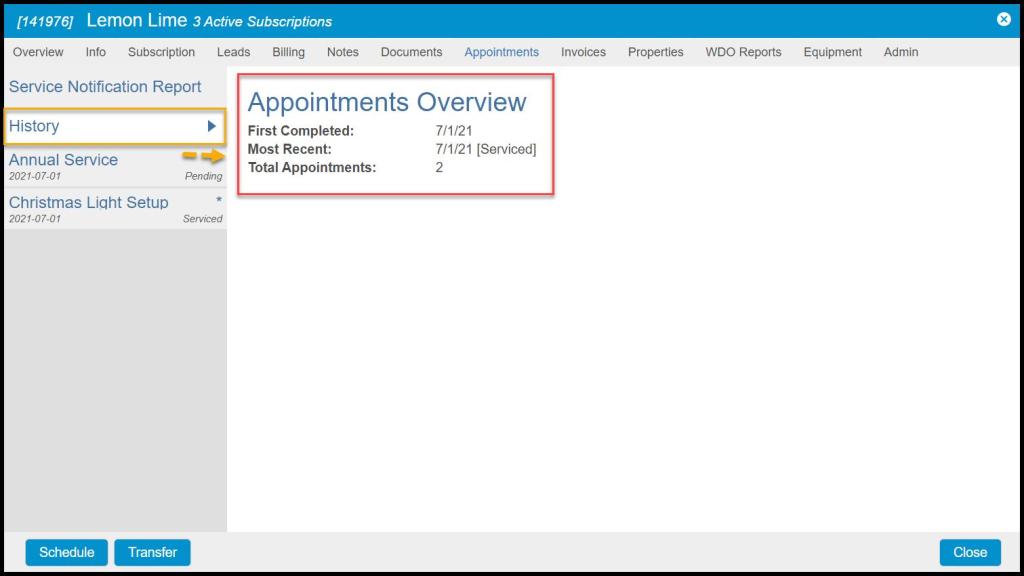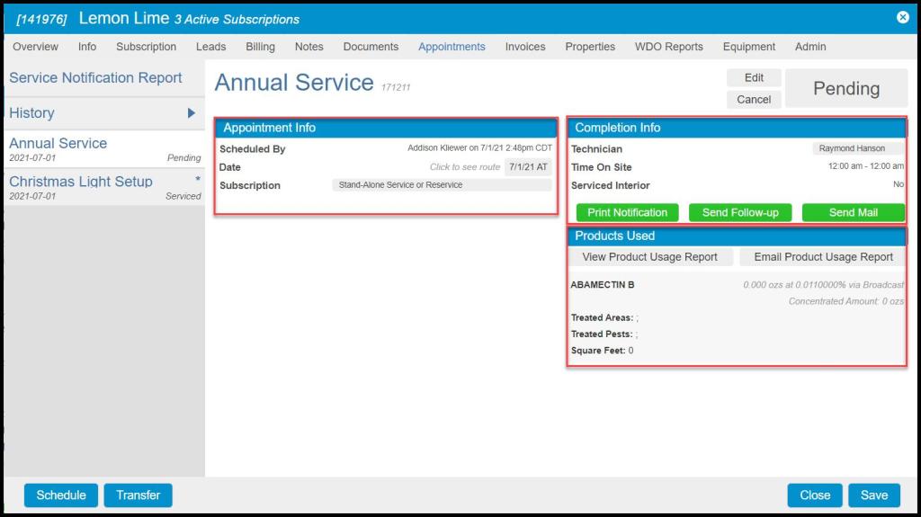 The Appointments Tab displays a record of the customer’s service notifications, history, and a Service Notification Report.