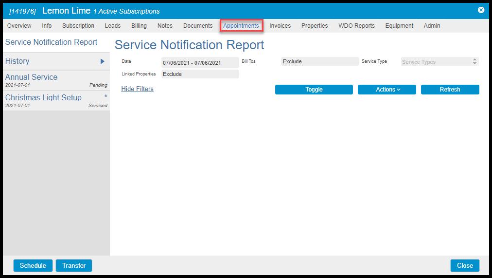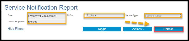 To filter the Service Notifications Report in the Appointments Tab, toggle these filters.