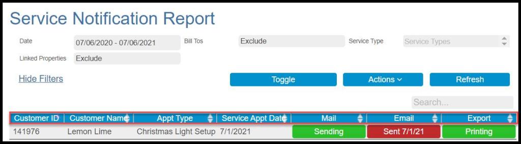 When viewing the Service Notifications report, notice how each customer has an action button for each type of communication. This action button will determine if the customer will receive the notification or not when sending out communications.