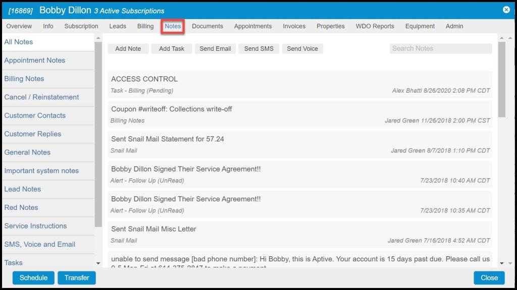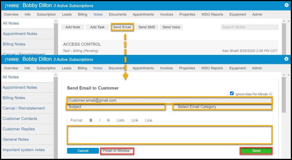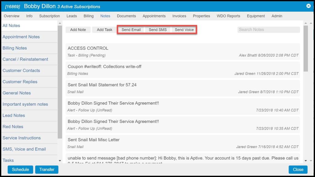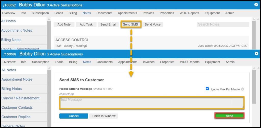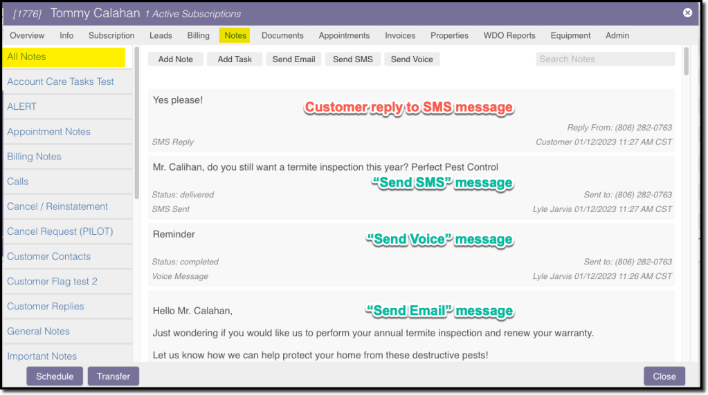 Using this functionality has the additional benefit of leaving a new NOTE in the log to record the message and timestamp of the communication for future reference, and SMS messaging will even record any REPLIES the customer sends back.