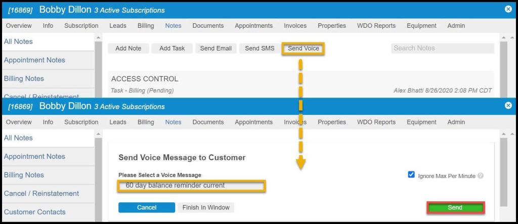 To send a voice message to a customer, select Send Voice and a new field will appear for selecting the voice message to send to this individual customer. The voice message will be delivered to the phone number in the Phone 1 field in the Customer Card > Info tab.