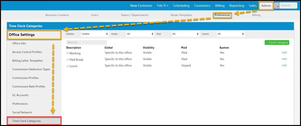 Admin > Preferences > Office Settings > Time Clock Categories.
