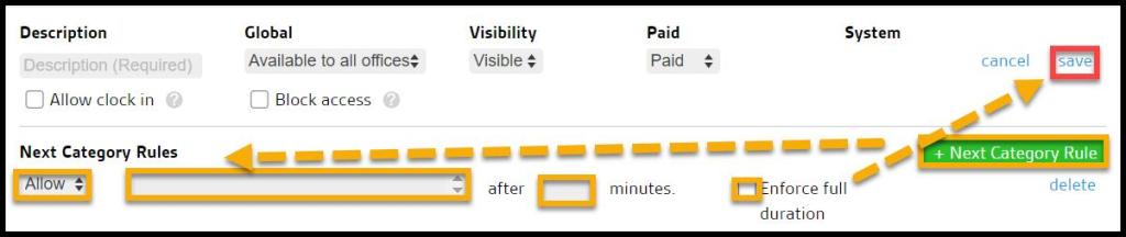 - Enforce Full Duration: Prevents users from clocking out until they clock into a category specified in the rule.