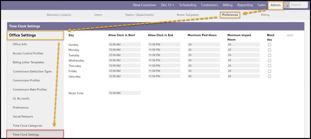 To access the Time Clock Settings, go to: