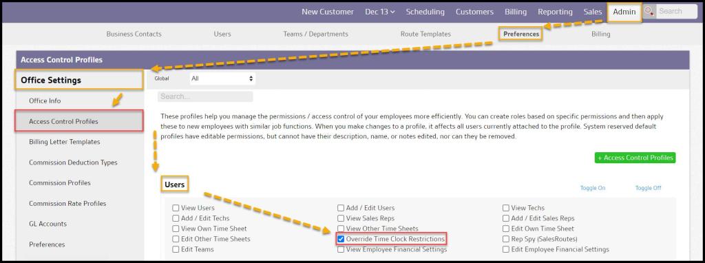 Admin > Preferences > Office Settings > Access Control Profiles > select the desired user > Users > select Override Time Clock Restrictions.