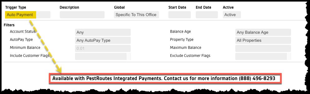 NOTE: This Trigger Rule type is exclusively available to customers using FieldRoutes Payments, due to additional functionality enabled by this integration. Customers subscribed to 3rd-party payment processors will see a reminder that switching will also allow them to use this rule. See the Payments > Auto Payment Trigger Rule guide for full coverage of this rule.